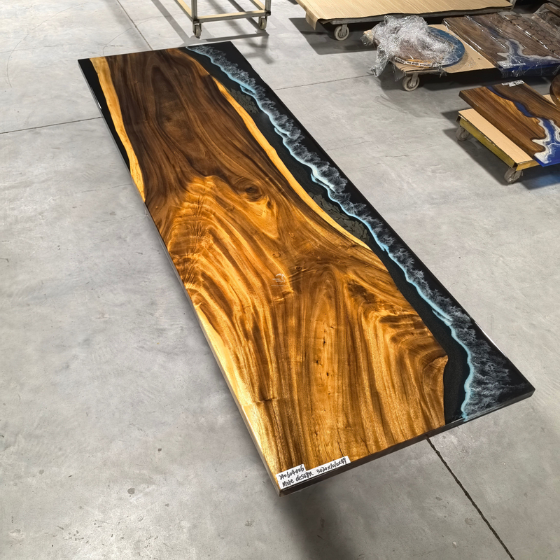 Our company newly developed solid wood table for epoxy resin, solid wood have South American walnut, oak and American walnut, zebra, cherry wood, etc., all products can be produced according to customer's design , the moisture content of solid wood under 14%, imported brand resin,the color is optional, this product is an artwork,so the production cycle is longer, the product specifications 500-5000 x300-1500 x50mm, other specifications also can be customized.