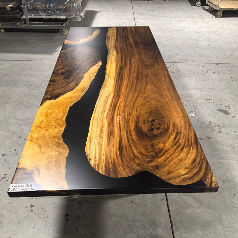 Our company newly developed solid wood table for epoxy resin, solid wood have South American walnut, oak and American walnut, zebra, cherry wood, etc., all products can be produced according to customer's design , the moisture content of solid wood under 14%, imported brand resin,the color is optional, this product is an artwork,so the production cycle is longer, the product specifications 500-5000 x300-1500 x50mm, other specifications also can be customized.