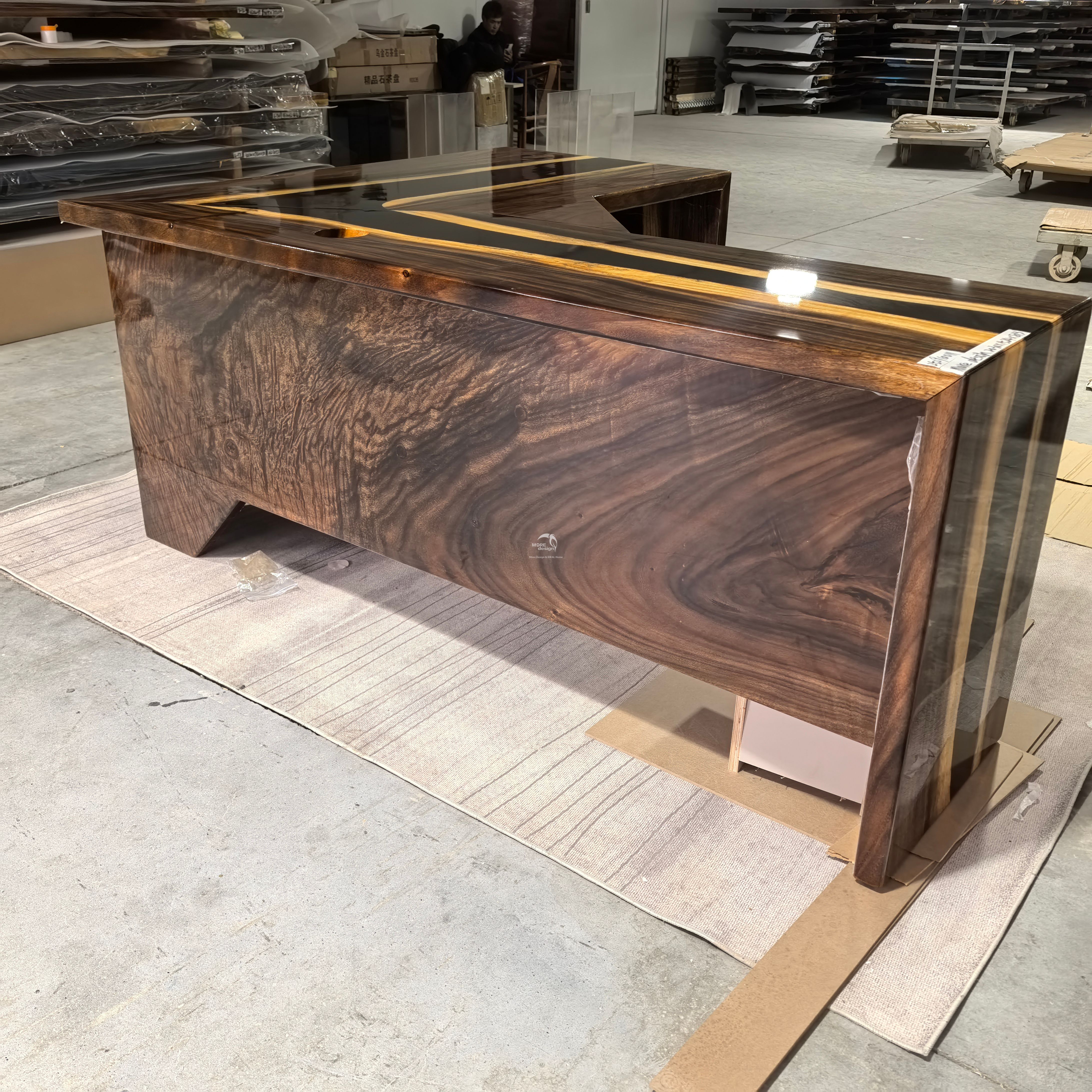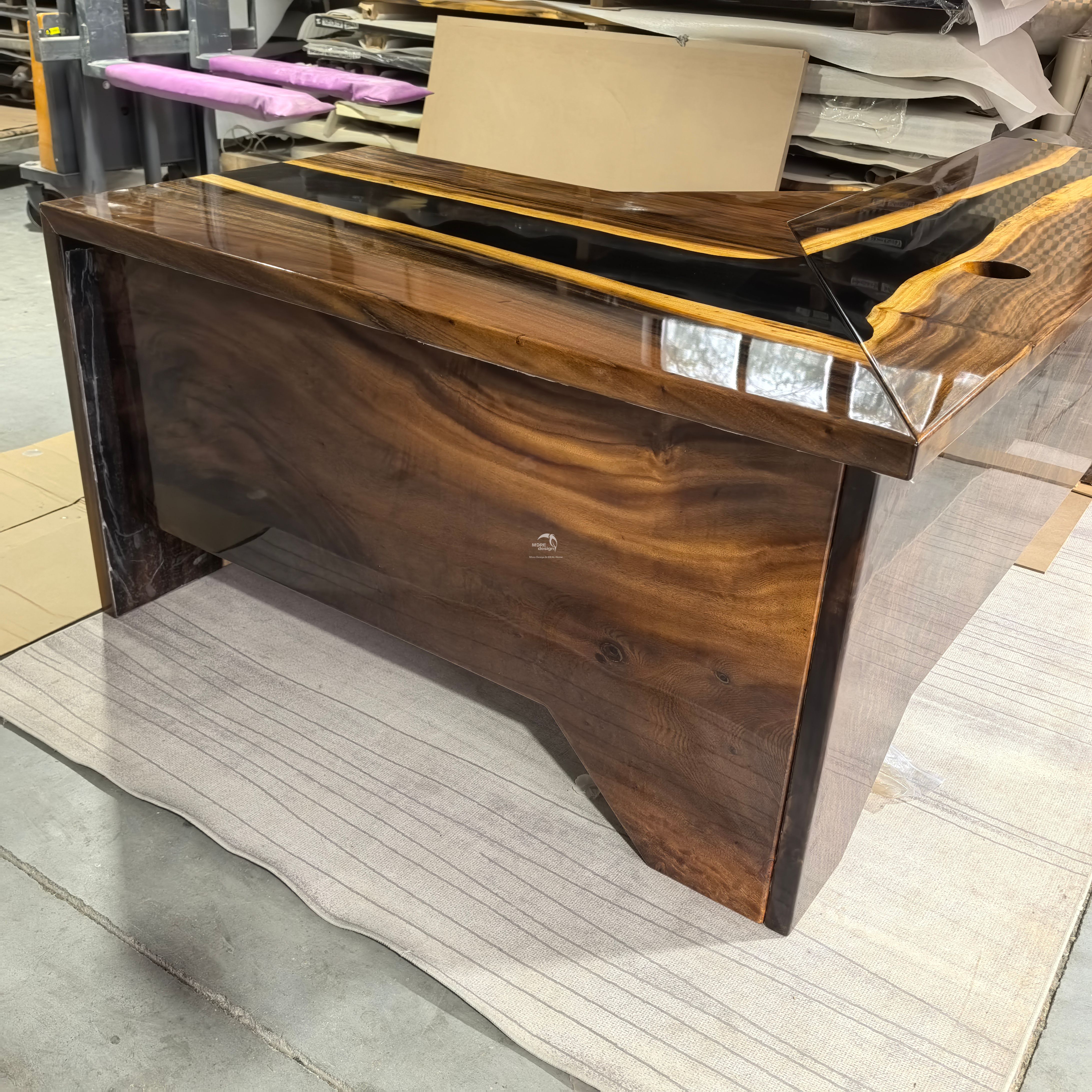 Our company newly developed solid wood table for epoxy resin, solid wood have South American walnut, oak and American walnut, zebra, cherry wood, etc., all products can be produced according to customer's design , the moisture content of solid wood under 14%, imported brand resin,the color is optional, this product is an artwork,so the production cycle is longer, the product specifications 500-5000 x300-1200 x50mm, other specifications also can be customized.